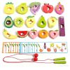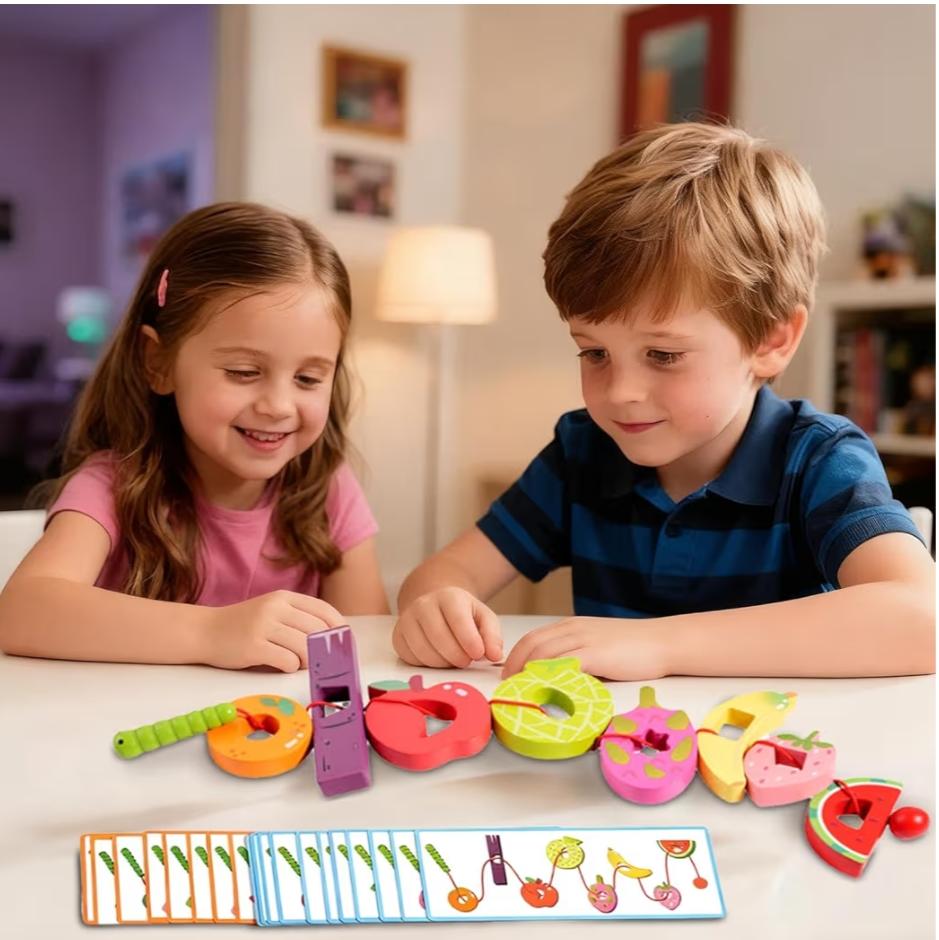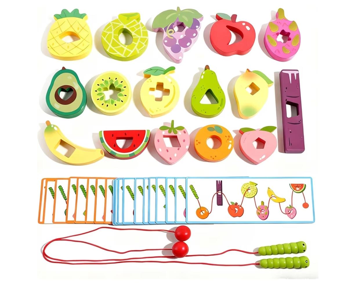 – Components: The set typically includes a string with a wooden worm attached at one end and multiple wooden fruit pieces (such as apples, pears, and kiwis) with holes drilled through them.