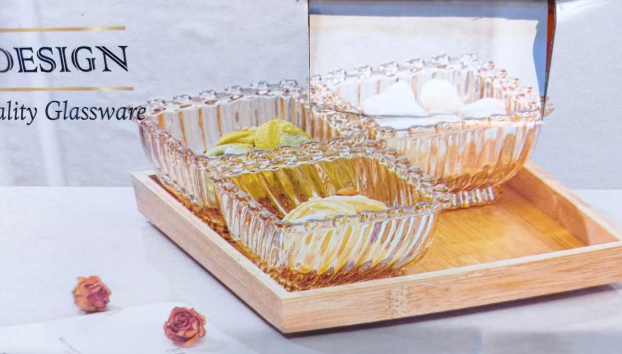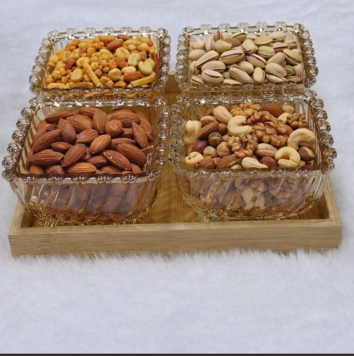 4 Crystal Glass Bowls on Bamboo Base