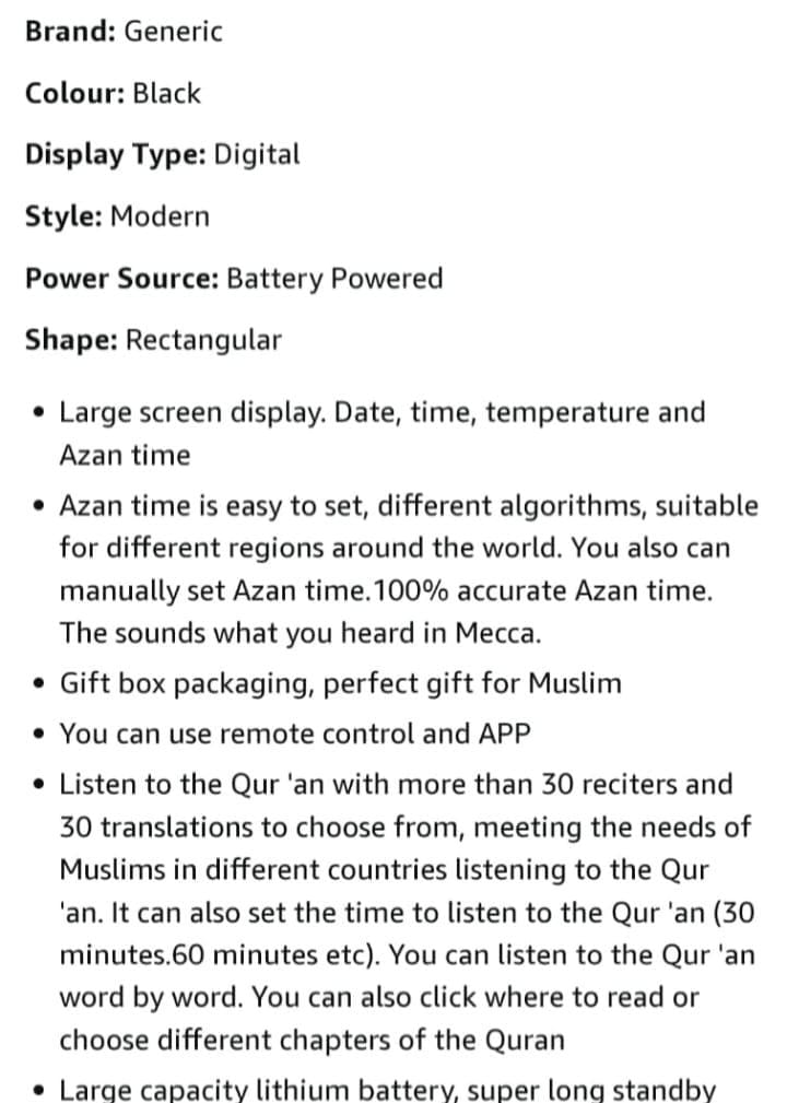 Easy to adjust: Thanks to its intuitive functionality, this clock is very easy to adjust. You can simply refer to the prayer times indicated on the screen and adjust them according to your needs.