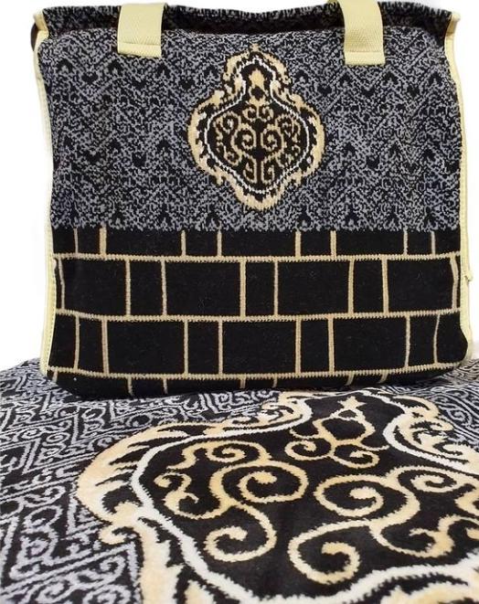 The beauty of the design is mixed with the luxury of the black colored premium musallah and the golden decorations that reflect the exquisite design of the covering and the wall of the Holy Kaaba